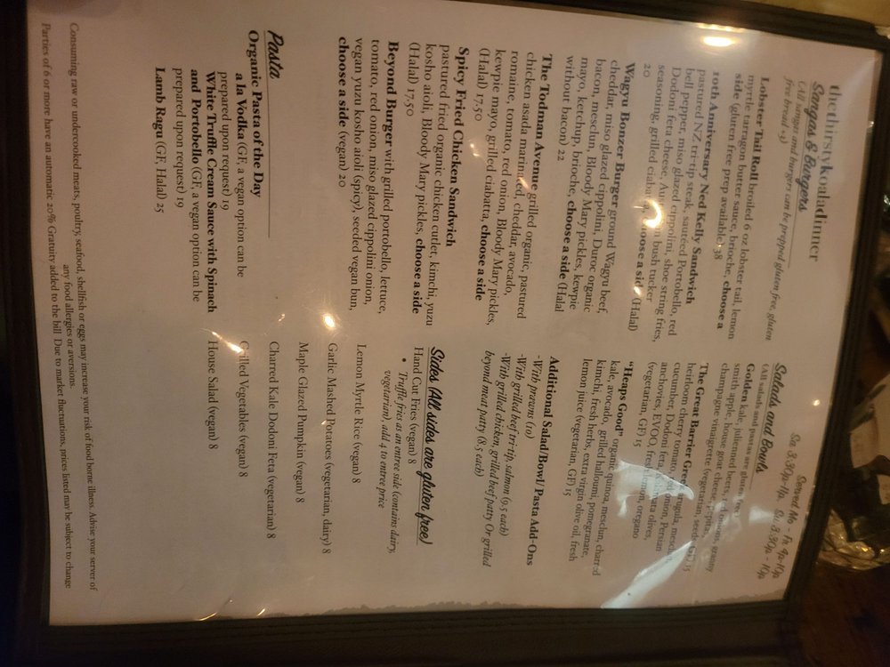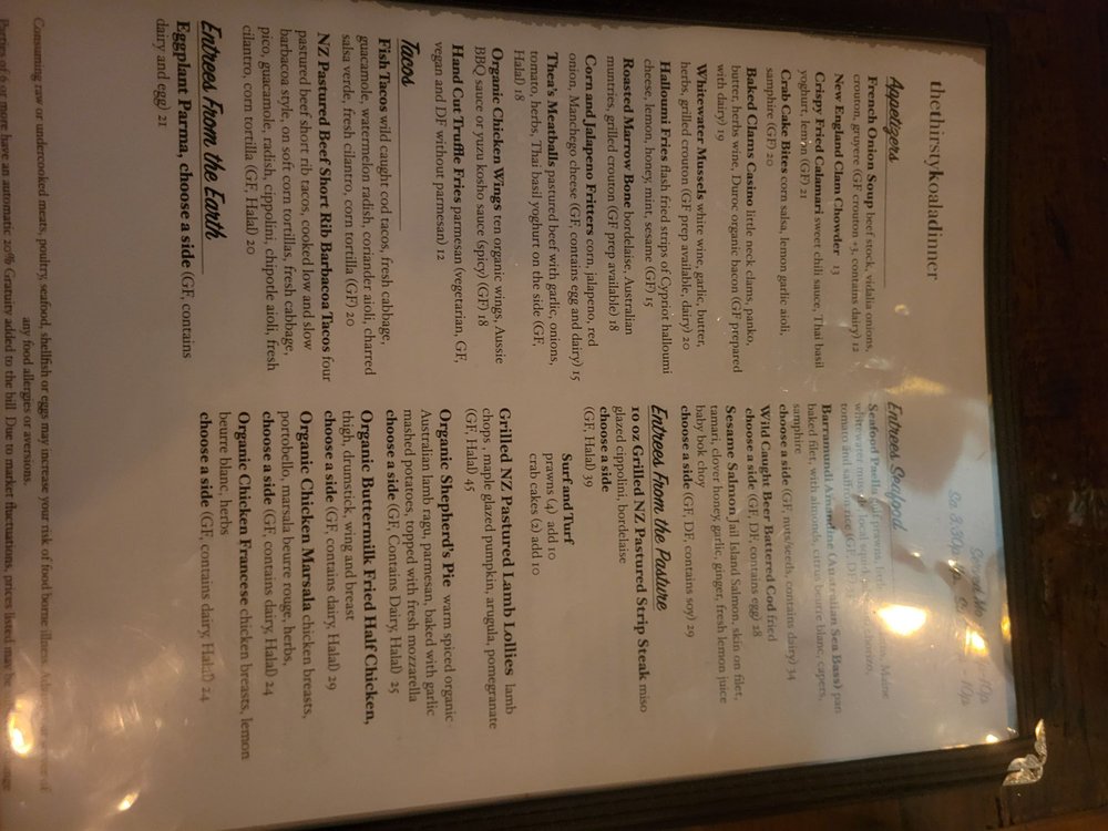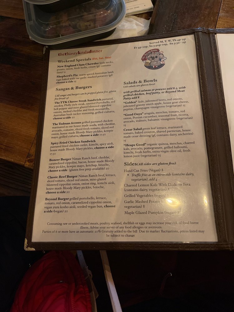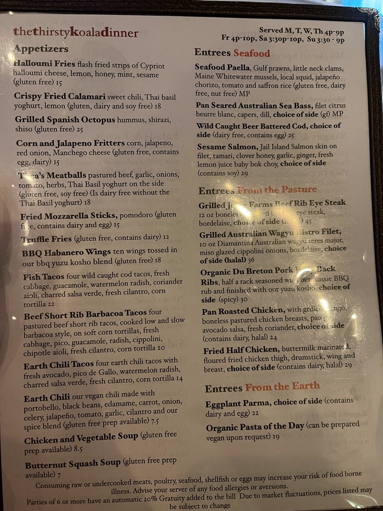 Introducing The Thirsty Koala, an Australian gastropub in Astoria, NY, offering a variety of breakfast and brunch options. This women-owned establishment provides vegan and limited vegetarian choices, with a focus on fresh, quality ingredients. Customers rave about the delicious dishes, like the corn fritters and shepherd's pie, as well as the friendly service and cozy ambiance. The menu features authentic Aussie cuisine, including favorites like grilled octopus, lamb lollies, and organic gnocchi with truffle cream sauce. Don't miss out on their happy hour specials and free Wi-Fi, making it a great spot for groups, families, and dinner outings. The Thirsty Koala's dedication to providing an enjoyable dining experience with unique flavors and attentive service sets it apart from other restaurants in the area.